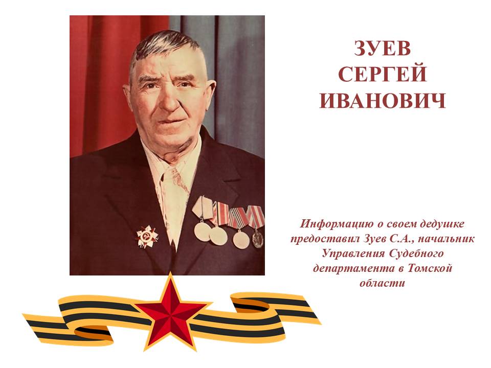 Сергей Иванович Зуев родился 6 октября 1912 года в селе Желудково Рязанской губернии. В 20-е годы, из-за голода, он вместе с родителями переехал в Восточный Казахстан. До начала войны работал плотником. Сергей Иванович был женат на Зуевой (Ветлугиной) Александре Семеновне, и у них было трое детей: сыновья Володя, Ваня и дочь Ниночка. Сергей Иванович был призван на фронт 28 августа 1941 года рядовым в пехоту. В первые дни войны стояла сильная жара, и его жена с младшей дочкой преодолела 10 километров, чтобы увидеться с ним. В условиях нехватки воды и пищи им приходилось пить прямо из реки. К сожалению, в эти тяжелые дни его дочь заболела и умерла, а затем не стало и сына Володи. После учебки Сергей Иванович попал под Москву вместе с легендарными сибирскими дивизиями, которые остановили фашистов у стен столицы. Он был ранен в плечо, что, как он сам рассказывал родным, спасло ему жизнь — почти никто из его однополчан не выжил в тех боях. Затем его направили в 63-й гвардейский артиллерийский полк 30-й стрелковой дивизии Второго Прибалтийского фронта, где он воевал до конца войны. 19 ноября 1944 года Зуев Сергей Иванович был награждён медалью "За отвагу". Он не любил рассказывать о своих переживаниях на войне, но недавно родные узнали о его подвиге. 31 октября 1944 года, во время боёв за высоту 112,0, он доставил пищу солдатам и попал под ураганный огонь фашистов. Используя личное оружие, он уничтожил четырёх гитлеровцев. Сергей Иванович был дважды ранен, но вернулся с войны домой. После войны у него родилось ещё трое сыновей. Он ушёл из жизни 18 мая 1995 года — всего через девять дней после празднования 50-й годовщины Победы. Проводить Сергея Ивановича в последний путь пришло много людей: друзья, соседи, товарищи по работе и просто знакомые. Вечная память и низкий поклон Сергею Ивановичу Зуеву и всем тем, кто подарил нам эту Победу, мир и жизнь! ![]() |